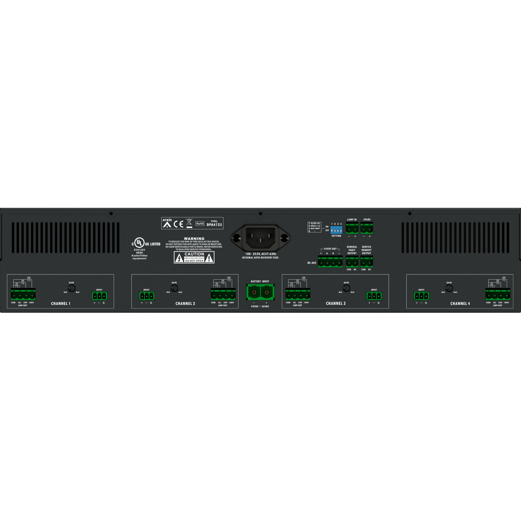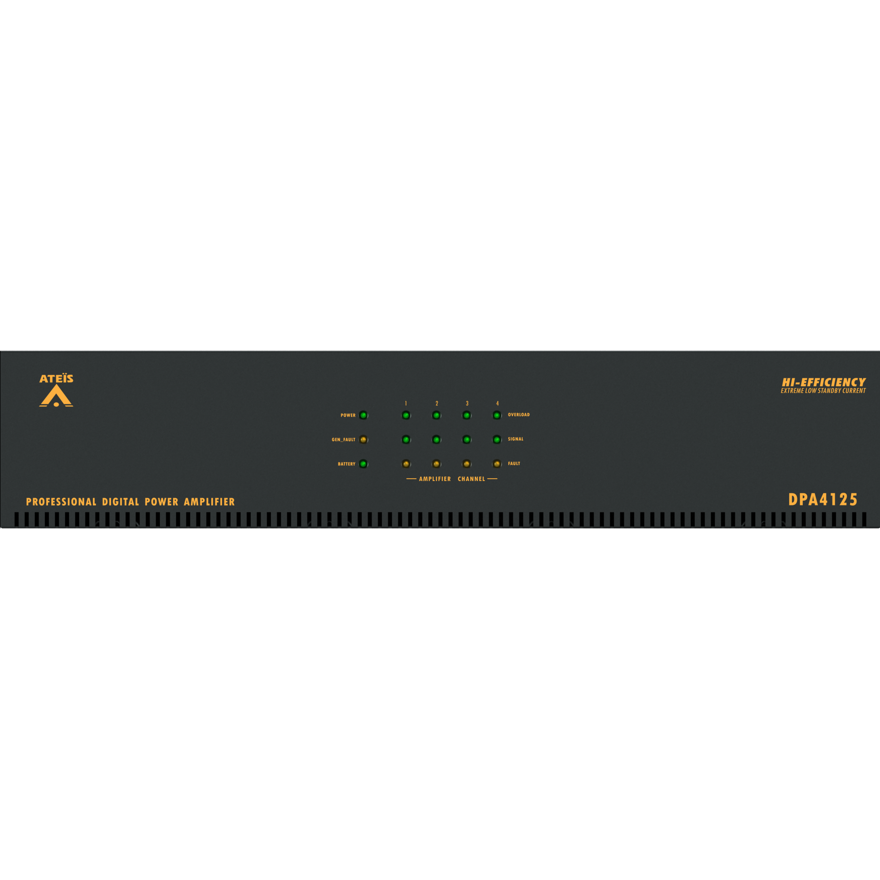 Цифровой профессиональный 4-х канальный усилитель мощности класса D мощностью 4х125 Вт (разъемы для подкл. в комплекте). Вход Phoenix Euro Block, выходы усилителя 100 В, 50 В, 8 Ом. Разъем для подкл. резерв. источ. питания, мостовой режим, рэковое исполнение 2U. Габариты 437 x 88 x 370 мм, вес 14,5 кг